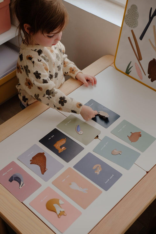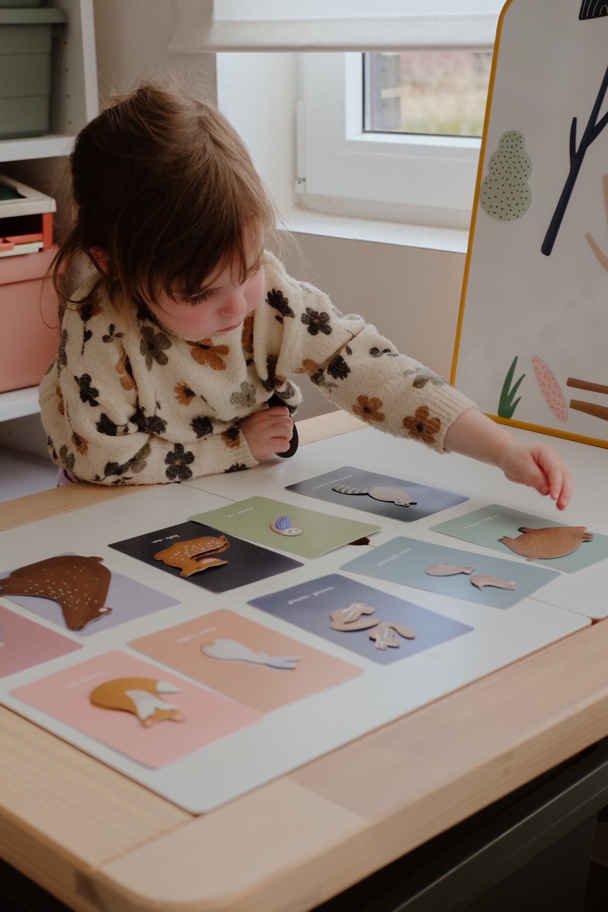 She also loves to sort them (by color, by size,…) or make it a guessing game. She turns the magnets over, so you just see the black side and then she asks us what animal,… it is.